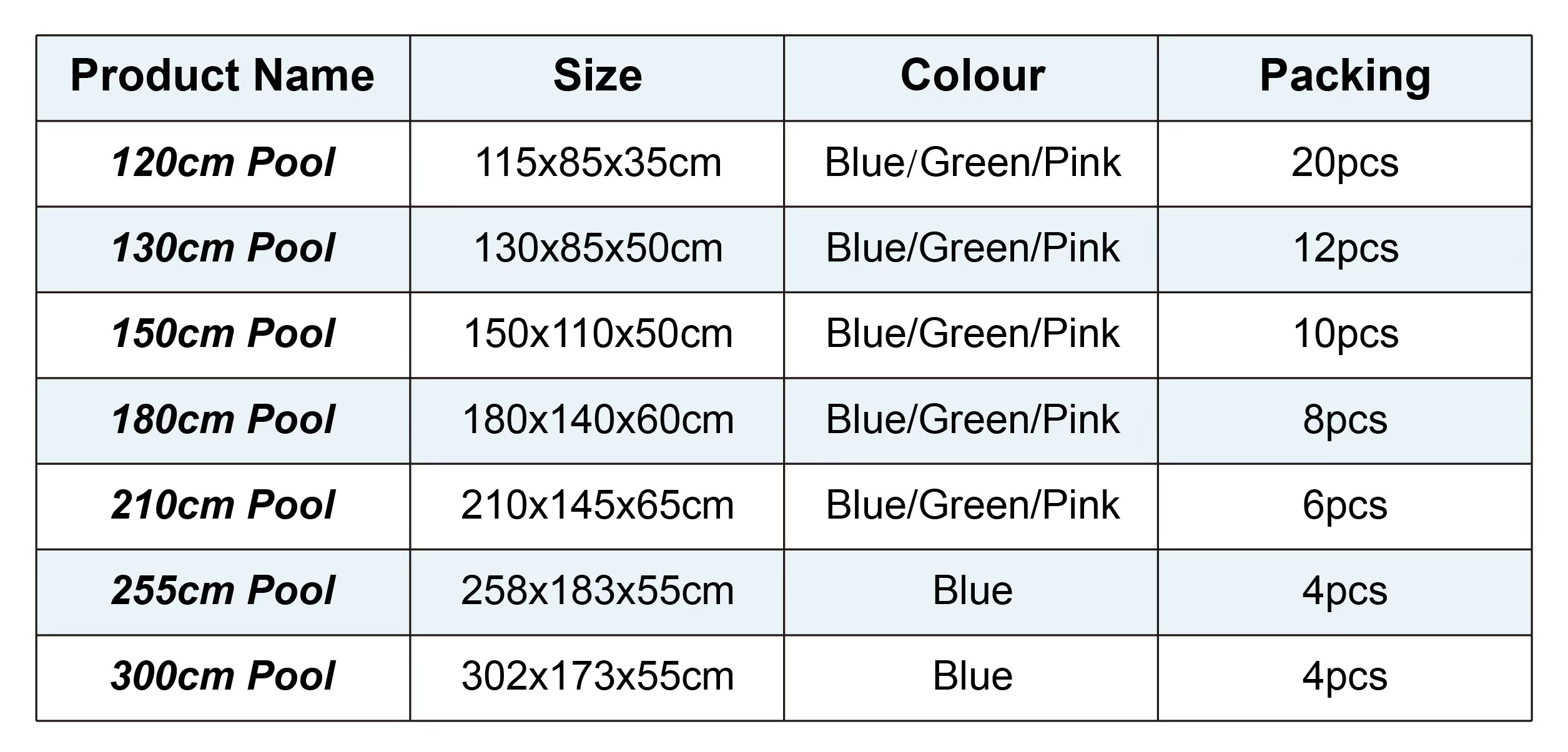120cm, 130cm, 150cm, 180cm, 210cm, 255cm, 300cm