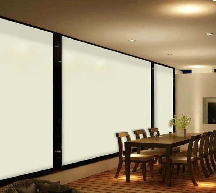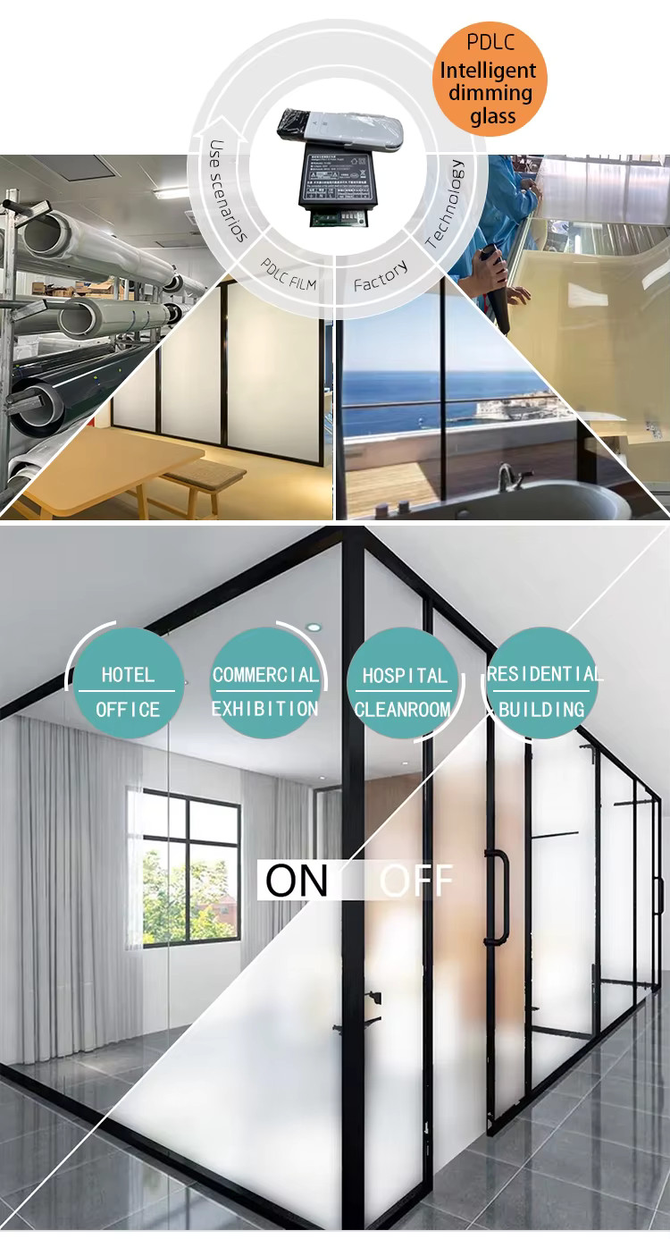 It is a liquid crystal display function film It is in the PDLC dimming film coated with AB glue, affixed to the glass surface; Can achieve dimming film glass penetration and privacy protection . It uses a polymer dispersion liquid crystal (PDLC) as a display structure It is a two-layer flexible transparent conductive film as an electrode Able to adjust the voltage under the moment to achieve a transparent and opaque switch
